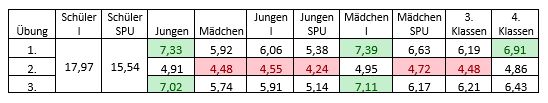 Die Ergebnisse sind der unten genannten Tabelle zu entnehmen. Die Tabelle ist nach den Übungen des TP Testes und den Zielgruppen gegliedert. Zuerst ist hier die durchschnittliche Punktezahl der intakten Schüler (I) und der Schüler mit spezifischen Lernstörungen (SPU) im gesamten TP Test dargestellt. Dann sind die in den konkreten Übungen des TP Testes erreichten Durchschnittswerte der Punktezahlen angegeben. Zum Zwecke der Übersichtlichkeit sind die Werte der Teilziele farblich markiert. Die grüne Farbe stellt 5 höchste Werte der Teilziele dar, also die besten Ergebnisse in den gegebenen Übungen. Die rote Farbe bezeichnet 5 niedrigste Durchschnittswerte der Teilziele, d.h. die niedrigste Punktezahl in den konkreten Übungen des TP Testes.
