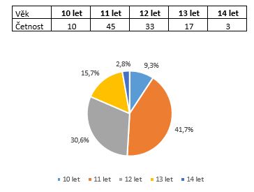 Z celkového počtu respondentů N = 108 bylo 49 chlapců, což představuje 45,4 %, a 59 dívek, tedy 54,6 %, jejichž věkové složení je 10–14 let.