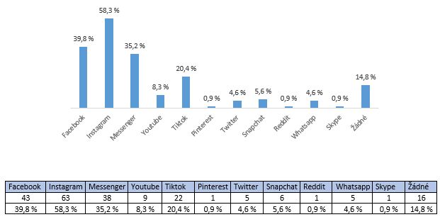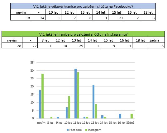 Pro potřeby článku byly vybrány společné otázky, které ukazují, jaké sítě jsou mezi žáky populární a potvrzují, že děti ve věku 10-14 jsou aktivními uživateli Facebooku a Instagramu.