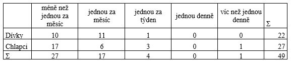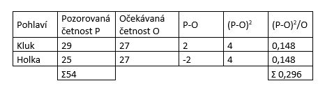 Testové kritérium Chí (4,15) je větší než kritická hodnota testového kritéria (vypočítaná v excelu pomocí funkce CHINV) (3,36), proto odmítáme nulovou hypotézu a přijímáme alternativní. Mezi četností příspěvků na Facebookové zdi chlapců a dívek je statisticky významný rozdíl.