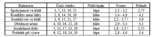 Poslední využitou metodou byla využití standardizované techniky pro měření klimatu školní třídy známé pod názvem Naše třída. 3 Dotazník je určený pro děti od 8 do 15 let, tedy věkovou skupinu přesně odpovídající našemu výzkumnému vzorku. Nástroj obsahuje 30 jednoduše formulovaných položek a respondenti odpovídají na pětibodové Likertyho škále (1 = nejvíce výstižné, 2 = dosti výstižné, 3 = těžko rozhodnout, 4 = málo výstižné, 5 = nejméně výstižné). Dotazník se vyhodnocuje pomocí celkových průměrných skórů v šesti měřených kategoriích třídního klimatu (spokojenost ve třídě, konflikty mezi žáky, soutěživost ve třídě, obtížnost učení, soudržnost třídy a pořádek při výuce), kdy pro každou kategorii skóruje pět otázek (Lašek, 2001).