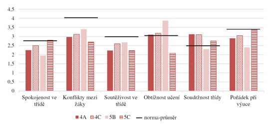 Na základě výsledků šetření můžeme konstatovat, že v kategoriích spokojenost ve třídě a pořádek při výuce jsou výsledky dobré až průměrné; v těchto kategoriích vykazuje třídní klima velmi dobrou kvalitu, děti jsou ve třídě tedy zjevně spokojené a poměrně dobře hodnotí i pořádek ve výuce ve všech sledovaných třídách. Dobrých výsledků (kromě jedné sledované třídy) dosahuje klima také v kategorii obtížnosti při učení. Pozornost však vzbuzují další aspekty klimatu, které dotazník zjišťoval, a to konflikty mezi žáky, soutěživost ve třídě a soudržnost třídy. Z Grafu 1 vyplývá, že míra konfliktů i soutěživosti ve sledovaných třídách vykazují vysokou úroveň. Je ovšem možné, že se právě vysoká úroveň konfliktů ve třídě odráží ve výsledcích kategorií soudržnost třídy a soutěživost ve třídě. Je zřejmé, že žáci mají mezi sebou poměrně vysoké množství konfliktů, ovšem učitelé je patrně dokážou efektivně řešit, jak ukazují dobré výsledky v ostatních částech dotazníku (spokojenost ve třídě a pořádek ve výuce). Žáci však zjevně pociťují tlak ve výkonové oblasti a zdá se, že učitelé více preferují kompetitivní prostředí před spolupracujícím. Vyvstává proto otázka, zda právě podpora soutěživosti nezvyšuje míru konfliktů mezi dětmi – i taková interpretace se zde nabízí.