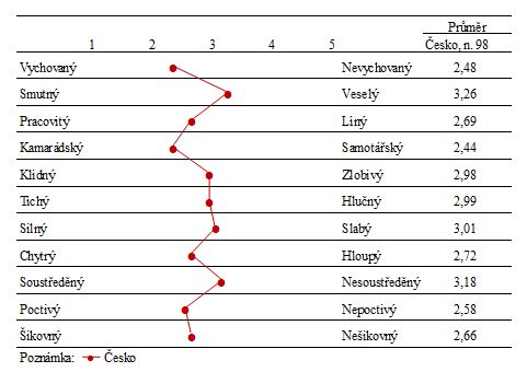 Pomocí sémantického diferenciálu jsme hodnotili postoje dětí ke spolužákovi (spolužákům) se speciálními vzdělávacími potřebami. Při zadávání dotazníku jsme předpokládali, že tento pojem je všem žákům dobře známý už proto, takového spolužáka ve třídě již několik let mají a z provedených rozhovorů bylo zřejmé, že všichni učitelé s celou třídou komunikují o problematice inkluzivního vzdělávání žáků se SVP. V Grafu 2 tedy můžeme sledovat, jaké postoje zaujímají k těmto žákům jejich spolužáci ve čtvrtých a pátých třídách ZŠ a je patrné, že tyto děti vnímají žáky se SVP do určité míry jako rušivé a považují je za spíše náladové a smutné. Celkově však můžeme konstatovat, že postoje žáků jsou ke spolužákům se SVP obecně spíše neutrální, v některých případech až mírně negativní. Výsledky tak naznačují, že přístup spolužáků k žákům se SVP je opatrný, respondenti se patrně zdráhali jednoznačně vyjadřovat k některým charakteristikám a přikláněli se zejména ke středním hodnotám. Přesto je možné identifikovat, jakou představu o svém spolužákovi se SVP žáci mají. Dle výsledků totiž posuzují spolužáky se SVP jako spíše vychované, uzavřené a celkem pracovité a kamarádské, na druhou stranu ale také jako náladové a často vyrušující.