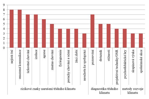 Sestava otázek užitých v polostrukturovaném rozhovoru se zaměřovala zejména na detekci rizikových oblastí inkluzivní edukace žáků se SVP ve sledovaných třídách, rizika adaptace těchto žáků v třídním kolektivu a na možnou souvislost inkluzivního vzdělávání těchto žáků s celkovou kvalitou třídního klimatu. Rozhovory byly zpracovány dle pravidel platných pro obsahově kategoriální analýzu. Po provedení otevřeného kódování u všech rozhovorů s učiteli se kódy logicky strukturovaly do 3 oblastí, které dále hlouběji analyzujeme (pro lepší přehlednost jsme se rozhodli interpretovat první a druhou oblast společně). V grafech jsou znázorněny četnosti výroků odpovídajících jednotlivým kódům, které se vyskytly v celé skupině respondentů.