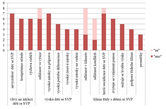 Dalším z faktorů, který učitelé často zmiňovali při rozhovorech, byla specifika vyskytující se při inkluzivní výuce dětí se SVP v běžné třídě (Graf 4). Učitelé se vesměs shodli, že nejsou rozdíly mezi vztahy a klimatem ve třídách, kde jsou vzděláváni i žáci se SVP a kde tito žáci nejsou. Záleží totiž velmi na přístupu učitele, a také rodičů dětí. Učitelé trvali na tom, že klima tříd se v podstatě neliší od každé jiné běžné třídy.