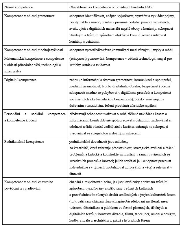 Předkládám tabulku, v níž je na levé straně uvedena klíčová kompetence pro celoživotní učení, jak je jmenuje Rada EU a napravo pak vybraná část její charakteristiky, která výrazněji koreluje se vzdělávacím obsahem či cílem F/AV (tabulka 1).