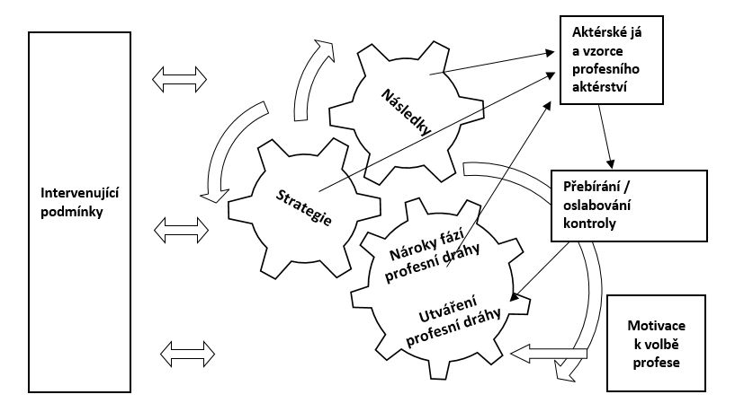 Aktérské já lze chápat jako způsob, jakým se jedinec selektivně angažuje a vyjednává, aby zajistil, rozvinul a udržel svou identitu (Billett, 2010), v případě aktérství profesního jde tedy o způsob vyjednávání a rozvíjení identity profesní. Z dat plyne, že u participantů a participantek je aktérské já utvářeno pod vlivem nároků profesních drah, strategií jednání a jejich následků v širším kontextu podmínek a v rámci biografických možností. Součástí aktérského já jsou také aktérské dispozice – schopnost nebo tendence činit volby, iniciovat jednání založené na těchto volbách a řídit sebe i prostředí v pracovních kontextech (Goller, Harteis ,2017, 91). V rámci těchto behaviorálních tendencí lze v datech odhalit vzorce aktérského profesního jednání, které jsou na jedné straně důsledkem komplexní, cirkulární interakce klíčových prvků paradigmatického modelu (nároky-strategie-následky) a zároveň determinovány intervenujícími podmínkami. Tyto vzorce jako určité dispozice aktérského já ke stabilnějšímu reagování v podmínkách profesního života pak mají vliv na přebírání nebo oslabování kontroly nad profesní dráhou (viz Obrázek 1).