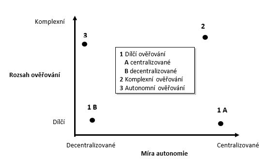 V matici (schématu) jsou graficky znázorněny dvě dimenze s kterými může hlavní politický aktér vzdělávací politiky MŠMT potažmo ČŠI manipulovat v rámci ověřování standardů TV. Dimenze „míra autonomie“ znamená vliv, který mají školy (aktéři) na proces testování standardů TV, ať už s pohledu tvorby testu nebo jeho administrace. „Rozsah ověřování“ znamená kolik diagnostických metod bude použito v rámci hodnocení naplnění Standardu TV, jelikož standardy tělesné výchovy vykazují specifikum, že jejich obsah není možné postihnout jediným testem. Předkládáme možné varianty ověřování standardů TV ve školní praxi. Návrhy jsou určeny pro zjišťování naplnění standardů TV II. stupně ZŠ, tj. žáky 9. ročníku.