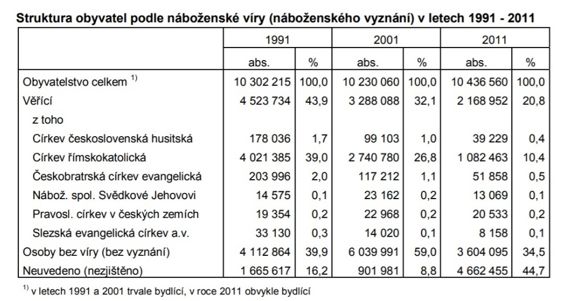Aktuální počty z probíhajícího sčítání lidu, domů a bytů z roku 2021 nemůžeme mít v současné době k dispozici, seznámíme se alespoň počty z předchozích let. Během dvaceti let se snížil podíl věřících osob, které se označují za věřící na polovinu. V roce 1991 se k víře přihlásilo necelých 44 % obyvatel České republiky. Údaje z posledního sčítání lidu, které proběhlo v roce 2011 ukazují, že počet věřících klesl na necelých 21 %. Z toho se 7 % občanů nepřihlásilo k žádné církvi. Při sčítání lidu v roce 2001 se k náboženskému vyznání hlásilo 32 % lidí. Na druhou stranu necelých 35 % obyvatel se přihlásilo do skupiny „bez náboženské víry“ a 45 % lidí svou náboženskou víru vůbec neuvedlo. (ČSÚ, ©2014)