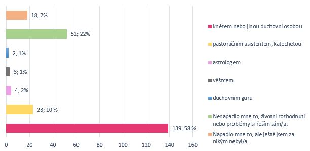 Ze zjištěných výsledků jsme zjistili, že dotazovaní své problémy a životní rozhodnutí nejčastěji konzultují s knězem nebo jinou duchovní osobou a to v 58 % (139). Další část dotázaných 22 % (52) prozatím nenapadlo své životní rozhodnutí a problémy konzultovat ani s jednou osobou, která by byla v seznamu možností. Vyjma kněží a jiných duchovních osob, dotazovaní lidé vyhledávají také pastorační asistenty nebo katechetky 10 % (23), aby se s nimi poradili případně s nimi zkonzultovali jejich problém, nebo nějakou nelehkou životní situaci.