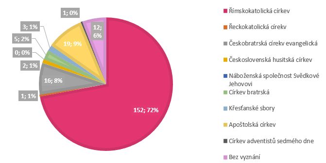 Nejpočetněji zastoupení v našem výzkumném vzorku má Římskokatolická církev 72 % (152). Tento jev nás mezi dotazovanými ani v rámci společnosti nijak nepřekvapil. Následující církví, která je zde četně zastoupená, je Apoštolská církev 9 % (19) a Českobratrská církev Evangelická 8 % (16). Další církve jsou ve výzkumném vzorku v nižším zastoupení.