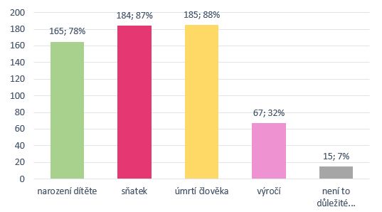 Dotazovaných jsme se ptali, jestli si myslí, že je důležité absolvovat církevní obřady při událostech jako je narození dítěte, uzavření manželství, úmrtí člověka, výročí. Podle zjištěných informací a z grafu 9 je očividné, že provádět církevní obřad při vstupu do manželství vnímá 87 % (184) a při úmrtí člověka 88 % (185) dotazovaných. Důležitý je pro respondenty též církevní obřad křtu malého dítěte 78 % (165). U různých výročí je toto vnímání značně nižší, a to jen 32 % (67). Jsou zde dotazovaní, kteří si myslí, že provádět církevní obřady při těchto událostech není důležité. Tito lidé jsou zde zastoupení v 7 % (15).