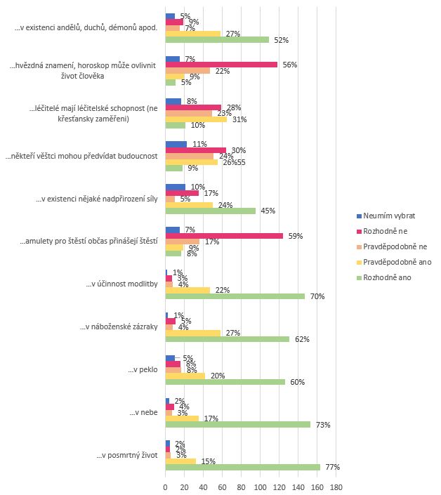 Z grafu můžeme vyčíst, čemu dotazovaní věří. Vybrali jsme několik položek, mezi kterými měli vyjádřit míru jejich souhlasu případně nesouhlasu. Největší míra souhlasu se objevila u víry v posmrtný život 77 % (163), v nebe 73 % (153), v účinnost modlitby 70 % (147), v náboženské zázraky 62 % (131) a ve víře v peklo 60 % (126). Naopak 59 % (124) dotazovaných rozhodně nevěří amuletům pro štěstí a hvězdným znamením, horoskopům 56 % (118).