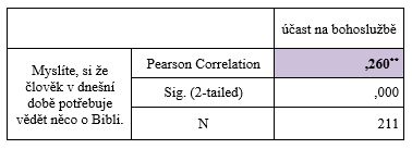 Z výsledků vyplynul jiný silný signifikantní vztah, a to mezi účasti na bohoslužbě, u lidí, kteří vnímají důležitost/potřebu vědět něco o Bibli. O něco silnější byl ještě vztah mezi lidmi, kteří byli vychováváni v náboženském duchu, a tedy mají potřebu se účastnit bohoslužeb.