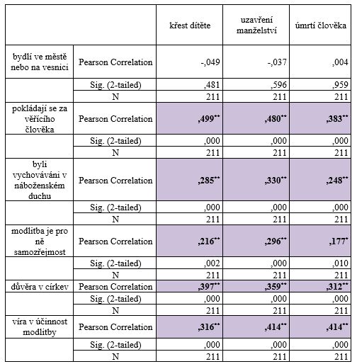 Korelace mezi lidmi, kteří žijí ve městě nebo vesnici a důležitostí provádět církevní obřady se neprokázal. Ze zjištěných dat vyvstaly signifikantní vztahy mezi důležitostí vybraných církevních obřadů a tím, zda se lidé pokládají za věřící; mezi lidmi, kteří byli vychováváni v náboženském duchu; lidmi, pro které je modlitba samozřejmostí; lidmi, kteří důvěřují církvi, jako organizaci a těmi, kteří věří v účinnost modlitby. Pro lidi, kteří se pokládají za věřící, je důležité provádět církevní obřady u narození dítěte, při vstupu do manželství a úmrtí člověka. Za nejdůležitější tito lidé vnímají křest dítěte a uzavření manželství. Lidé, kteří byli vychováváni v náboženském duchu, vnímají za důležitější provádět církevní obřad při uzavření manželství významněji než křest dítěte nebo pohřeb. Také pro lidi, kteří věří v účinnost modlitby je uzavření manželství a pohřeb významnější než křest, kterému také přisuzují důležitost. Uzavření manželství a křest je důležitým obřadem pro lidi, kteří důvěřují v církev.