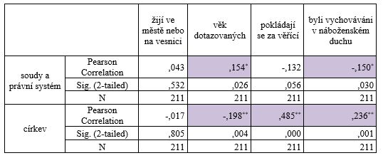 Ze zjištěných výsledků, jsme dále zjistili, že mezi lidmi, kteří žijí ve městě nebo na vesnici a důvěrou v organizace (soudy a právní systémy, církev, parlament a vláda ČR, evropský parlament, politické strany) neexistuje žádný vztah. Kde lidé žijí, nemá vliv na to, jak věří vybraným organizacím. Negativní signifikantní vztahy vyplynuly mezi věkem dotazovaných a korelací s důvěrou církví. Lidé v nižším věku méně důvěřují církvi. Pozitivní signifikantní vztah je mezi tím, zdali se pokládají za věřící a tím, jestli byli vychováváni v náboženském duchu ve vztahu s korelací s církví. Z toho vyplývá, že lidé, kteří se pokládají za věřící, více důvěřují církvi než lidé, kteří byli vychováváni v náboženském duchu. I když i tito lidé důvěřují církvi. Soudy a právní systémy korelují s tím, jaký má dotazovaný věk, i když je tento vztah slabě signifikantní. Negativní signifikantní je korelace mezi soudy a tím, jestli byli vychováváni v náboženském duchu. To znamená, že mladší lidé více důvěřují soudům a právním systémům. Naopak lidé, kteří byli vychováváni v náboženském duchu, věří v soudy a správní systémy méně. Mezi dalšími organizacemi se neprokázala korelace.