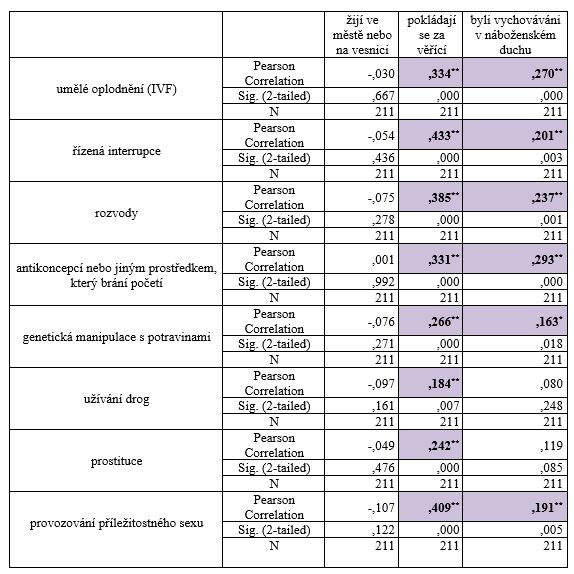 Vztah mezi tím, jestli lidé žijí ve městě nebo na vesnici a jejich souhlasem s tím, co vyznává a učí po staletí církev, se neprokázal. Ovšem ukázaly se korelace mezi tím, jestli byli vychovávání v náboženském duchu a tím, že se lidé pokládají za věřící lidi. Konkrétně vysoce signifikantní vztahy se projevily mezi lidmi, kteří se pokládají za věřící a nesouhlasem s umělým oplodněním, řízenou interrupcí, rozvody, antikoncepcí, genetickou manipulací s potravinami, prostitucí a provozováním příležitostného sexu. Nižší signifikantní vztah se projevil s nesouhlasem s užíváním drog. Lidé, kteří byli vychováváni v náboženském duchu, tak i nesouhlasí s umělým oplodněním, řízenou interrupcí a antikoncepcí nebo s jiným prostředkem, který brání početí. Nižší korelace je u genetické manipulace s potravinami a s provozováním příležitostného sexu. Prostituce je nepřípustná pro osoby, které se pokládají za věřící, ale lidi, kteří byli vychováváni v náboženském duchu, tak to tak nevnímají. Z takových výsledků můžeme usoudit, že dotazovaní lidé souhlasí s tím, co učí církev, a i s tím, co je v naší společnosti bráno za špatné. Názor společnosti na interrupci jsme předložili výzkumem od společnosti CVVM z roku 2009, kterého se účastnilo 1038 dotazovaných. Z těchto výsledků soudíme to, že lidé, kteří jsou věřící, mají hlubší spiritualitu a zvnitřněné hodnoty a postoje než lidé, kteří byli „jen“ vychováváni v náboženském/religiózním prostředí.