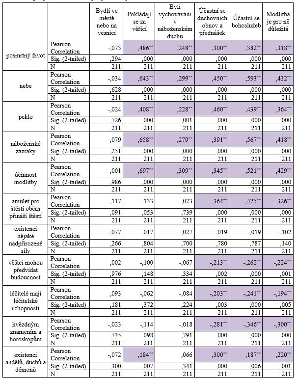 Vyvstal vysoce signifikantní vztah mezi lidmi, kteří se pokládají za věřící a jejich vírou v posmrtný život, nebe, peklo, náboženské zázraky a účinnost modlitby. Tito lidé také věří také v existenci andělů, duchů a démonů, ale méně. Lidé, kteří byli vychováváni v náboženském duchu, tak také věří v posmrtný život, nebe, peklo, náboženské zázraky a účinnost modlitby, ale o něco méně než lidé, kteří se pokládají za věřící. Lidé, kteří se účastní bohoslužeb, duchovních obnov a přednášek tak také věří ve výše zmíněné jevy, ale rozhodně nevěří amuletům pro štěstí, léčitelům, hvězdným znamením a horoskopům. Pro lidi, které je modlitba důležitá, tak věří zmíněným jevům, ale rozhodně nevěří amuletům pro štěstí, horoskopům a léčitelům.