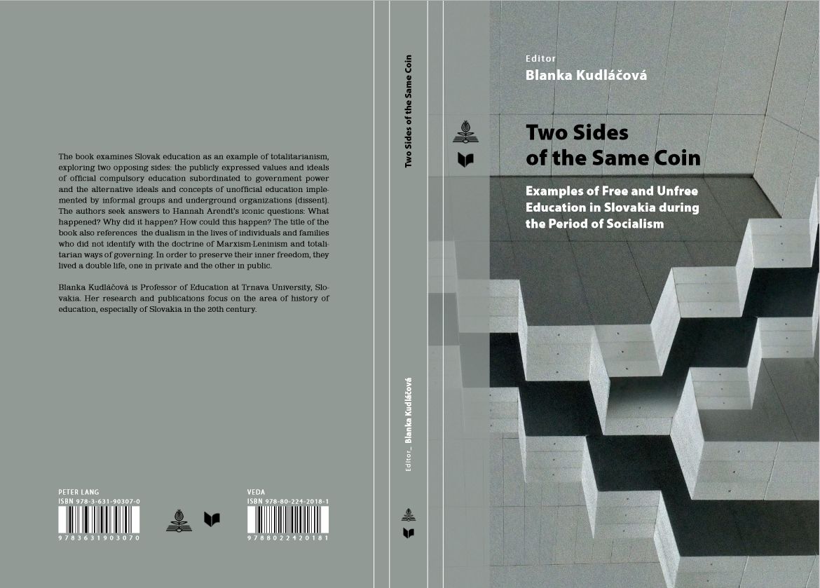 Kniha Two Sides of the Same Coin. Examples of Free and Unfree Education in Slovakia during the Period of Socialism je dielom kolektívu autorov pod vedením Blanky Kudláčovej, ktorý skúma školstvo a vzdelávanie na Slovensku v období socializmu. Autori publikácie hľadajú odpovede na ikonické otázky Hannah Arendtovej: Čo sa stalo? Prečo sa to stalo? Ako sa to mohlo stať? Publikácia môže pomôcť čitateľovi poodhaliť aj tajné, zatiaľ málo prebádané zákutia totalitného režimu a umožní mu pochopiť jeho zákernosť a nebezpečnosť, môže však byť tiež varovaním pred možnosťou recidívy nástupu arogancie neobmedzenej moci a rôznych foriem extrémizmu aj v súčasnosti. Autori približujú dve podoby výchovy a vzdelávania v sledovanom období, čo vystihuje názov „dve strany jednej mince“. Na jednej strane ide o verejne vyjadrené hodnoty a ideály oficiálneho povinného vzdelávania podriadeného vládnej moci, ktorého cieľom bolo vychovať nového človeka, resp. nové generácie budovateľov režimu, na druhej strane sú to alternatívne ideály a koncepcie neoficiálneho vzdelávania, realizované neformálnymi skupinami a rôznymi segmentami disentu, ktorých cieľom bolo aspoň čiastočne poskytnúť priestor slobode človeka a jeho tvorivému potenciálu. Názov knihy tiež odkazuje na dualizmus v živote jednotlivcov a rodín, ktorí sa nestotožňovali s doktrínou marxizmu-leninizmu a totalitnými spôsobmi vládnutia. Aby si zachovali vnútornú slobodu, žili akoby dvojakým životom, jedným v súkromí a iným na verejnosti. To potvrdzuje, že socialistická spoločnosť nebola len jednotvárnou masou zmanipulovaných jedincov, ale že v nej možno nájsť ostrovčeky slobodného života, alebo ako ich nazvali viacerí disidenti, „ostrovčeky pozitívnej deviácie“. Samozrejme, bolo to za cenu veľkých rizík, hrozby prenasledovania, perzekúcií a niekedy aj väzenia. Celá spoločnosť žila v akejsi dvojitej morálke (vonkajšej a vnútornej) a v dvojitej morálke žili aj jednotlivci, ktorí sa rozhodli žiť svoj život slobodne. Tento dvojitý život nebol jednoduchý: spôsoboval vnútorné napätia u detí, ktoré ešte dostatočne nechápali, prečo nemôžu doma aj na verejnosti hovoriť to isté, príp. správať sa rovnako, a spôsoboval napätia aj u dospelých, ktorí často riešili ťažké morálne dilemy a pýtali sa samých seba, kde je tá tenká hranica – nakoľko byť konformní s režimom a nakoľko si uchovať vlastnú integritu. Do hry totiž vstupovala ich profesionálna kariéra, budúcnosť ich detí, strata materiálnych výhod a pod.