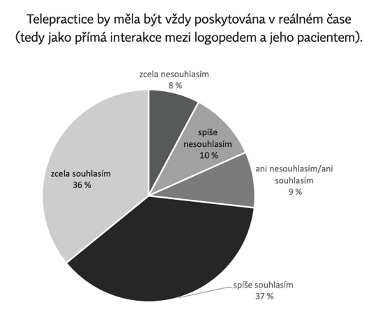 Dále byli respondenti tázáni na vlastní názor k tvrzení: „Telepractice by měla být vždy poskytována v reálném čase (tedy jako přímá interakce mezi logopedem a jeho pacientem).“ S tímto tvrzením zcela nesouhlasilo 7,8 % respondentů (n = 12), spíše nesouhlasilo 10,5 % (n = 16), ani nesouhlasilo / ani souhlasilo 8,5% (n=13), spíše souhlasilo 37,3% (n=57), zcela souhlasilo 35,9% (n=55).
