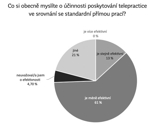 Podobně položenou otázkou zabývající se postojem dotazovaných logopedů na efektivnost telepractice. Konkrétně se jednalo o zjištění, zda logopedi považují poskytování telepractice za více efektivní, stejně efektivní či méně efektivní, než je standardní přímá práce s klientem. Respondenti měli možnost vybrat variantu „neuvažoval/a jsem o efektivnosti“ nebo možnost „jiné“. Nejvíce respondentů (61 %, n=79) zvolilo možnost méně efektivní, 21 % respondentů (n=27) zvolilo možnost jiné a svou odpověď zdůvodnilo.