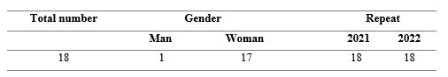 The pedagogical experiment took place at the Faculty of Education, Trnava University in Trnava, Priemyselná 4, 917 01 Trnava. Before conducting the experiment, we prepared a sample template of an ethogram divided into several main areas (sport, sleep, work, free time, eating, and hygiene) and sub-areas. The ethogram contained 14 items, of which 6 were the main ones. The ethogram method is commonly used in the study of the behavior of people of different ages (Sanchez-Martin et al., 2001; Barbosa, 2016; Weisfeld & Goetz, 2013). The prepared template was distributed among 18 natural science students aged 22 to 24. We chose undergraduate students for the experimental group. The experimental group consisted of 18 students, including 1 boy and 17 girls (Tab. 1). The low number of respondents was due to the complicated situation during the COVID-19 pandemic, while the predominance of girls in the study could be caused by the preference of natural science subjects by the female gender (Wandersee, 1986; Prokop, 2007). Other authors have also used a research sample with a number of approximately 20 respondents (Anderson & Gerbing, 1991; Kielhofner, 1986). The ethogram was distributed during pandemic measures, strict lockdown with a ban on going out, and distance learning (from 12.4. - 18.4.2021). The ethogram was distributed and collected online through Microsoft Excel. There were five lockdowns in Slovakia from 2020 to the end of 2021. Our research was conducted during the third lockdown in Slovakia, thus eliminating the effect of the first lockdown associated with finding a daily routine, etc. The second repetition of the ethogram took place approximately at the same time a year later (from 4.4. – 10.4.2022). The students recorded 10080 minutes, which represents the length of 7 days during pandemic measures and after their cancellation. All involved students participating in the research, and no one was excluded during the research. The students of the experimental group were selected by available sampling. Through the above-described tools of our research, we obtained data that we further subjected to statistical analysis in Statistika 12 and Microsoft Excel Version 16.49/2021 programs. At the beginning, we conducted a normality test (Shapiro-Wilk test), and we found that the sample did not have a normal distribution. We compared the average scores from the obtained responses in individual areas (sport, sleep, work, free time, eating, and hygiene) using the Wilcoxon paired test, which is suitable for non-normal distribution of the studied sample.