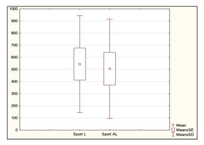 In the mentioned section, we focused on examining the change in the behavior of students in the field of sports during pandemic measures with distance learning compared to the behavior of students during in-person learning, after the end of pandemic measures. We calculated the average time that students spent on sports in both observed conditions. We expressed the calculated average as a percentage. During pandemic measures, students devoted 5.76 % of the total observed time to sports. After the cancellation of pandemic measures, students devoted 5.02 % of the total observed time to sports. We did not observe a statistically significant difference (p = 0.4008) in the time spent on sports during pandemic measures and after their cancellation (Graph 1).