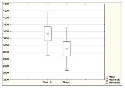 In the given section, we focused on studying the changes in students' behavior in the area of sleep during pandemic measures with distance learning compared to students' behavior during in-person learning after the pandemic measures ended. We calculated the average time that students spent on sports in both observed conditions. We expressed the calculated average as a percentage. During the pandemic measures, students spent 32.81% of the total observed time on sleep. After the pandemic measures were canceled, students spent 35.03% of the total observed time on sleep. We found a statistically significant difference (p = 0.0381) in the time spent on sleep during the pandemic measures and after their cancellation (Graph 2). Students spent less time on sleep during the lockdown and strict pandemic measures.