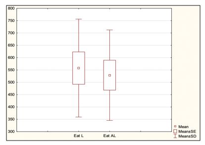 In this section, we examined changes in students' eating behavior during distance education pandemic measures compared to students' eating behavior during face-to-face, post-pandemic measures. We calculated the average time students spent eating in both conditions studied. We expressed the calculated mean as a percentage. During the pandemic measures, students spent 5.90% of the total observed time on eating. After the lifting of the pandemic measures, students devoted 5.23% of the total observed time to eating. We did not observe a statistically significant difference (p = 0.6784) in the time spent eating during the pandemic measures and after the lifting of the pandemic measures (Graph 4).
